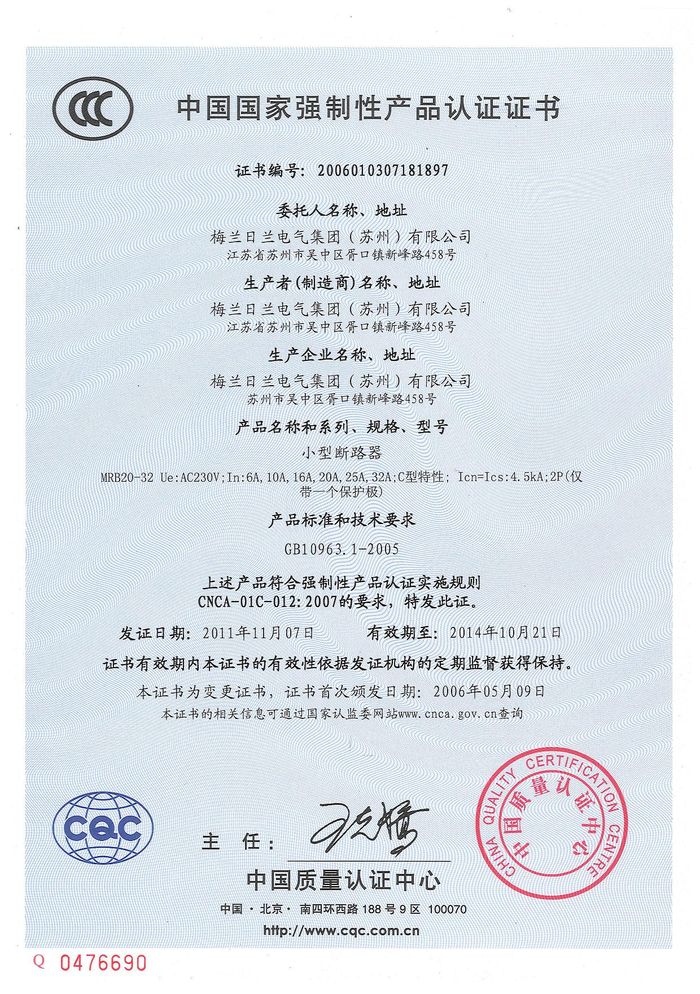 MRB20-32小型斷路器資質(zhì)證書